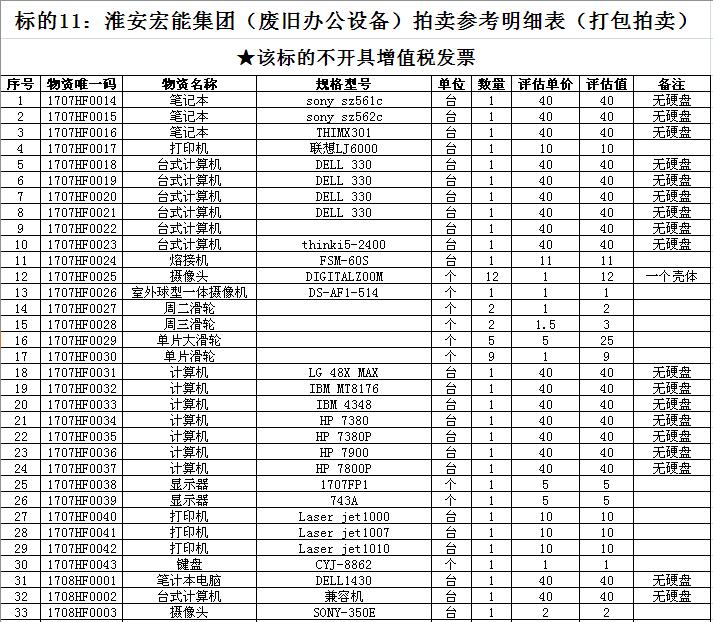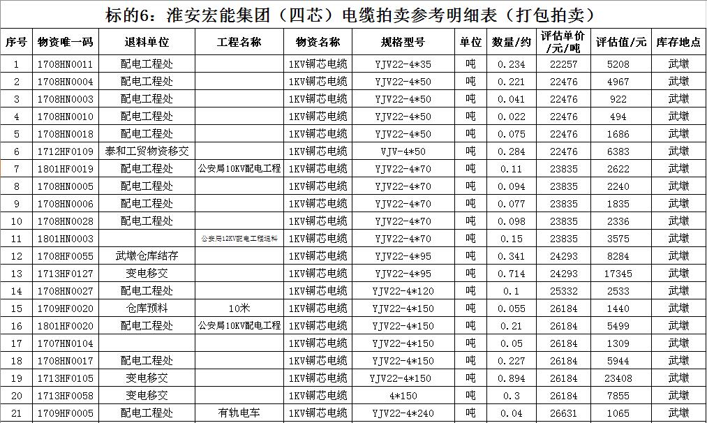 關(guān)注微信公眾號受淮安宏能集團有限公司委托,我公司將通過中國拍賣行業(yè)協(xié)會網(wǎng)絡(luò)拍賣平臺以網(wǎng)絡(luò)競價的方式公開拍賣廢舊物資一批,主要包括:各型電纜,計算機、打印機等辦公用品(詳見拍品目錄)。