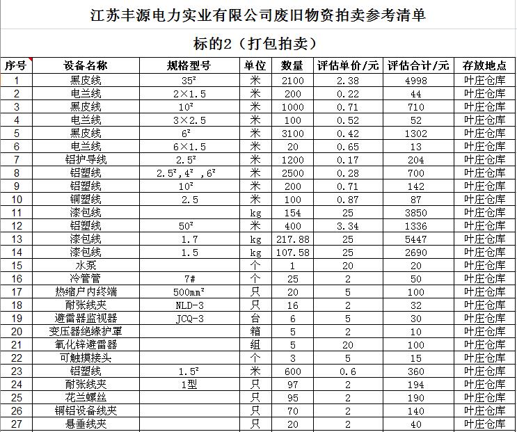 關(guān)注微信公眾號受江蘇徐供集體資產(chǎn)運營中心委托,我公司將通過中國拍賣行業(yè)協(xié)會網(wǎng)絡(luò)拍賣平臺以網(wǎng)絡(luò)競價的方式分兩批公開拍賣其下屬三家集體企業(yè)廢舊物資,主要包括:廢舊電纜、纜芯、鋼帶、導(dǎo)線、開關(guān)、電表、金具、廚房設(shè)備等(詳見拍品目錄)。