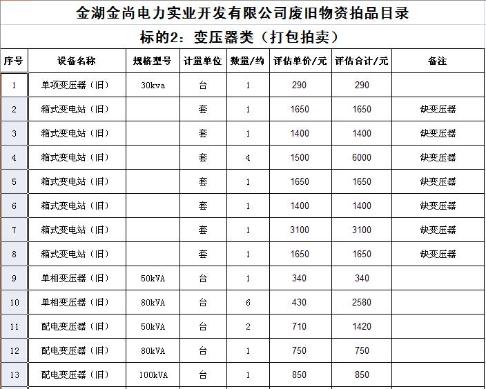 關(guān)注微信公眾號受金湖金尚電力實業(yè)開發(fā)有限公司委托,我公司將通過中國拍賣行業(yè)協(xié)會網(wǎng)絡(luò)拍賣平臺以網(wǎng)絡(luò)競價的方式公開拍賣廢舊物資一批,主要包括:電纜、導(dǎo)線、鋼芯鋁絞線、角鋼塔、鐵附件、金具、變壓器、箱式變電站、空調(diào)、電腦等(詳見拍品目錄)。
