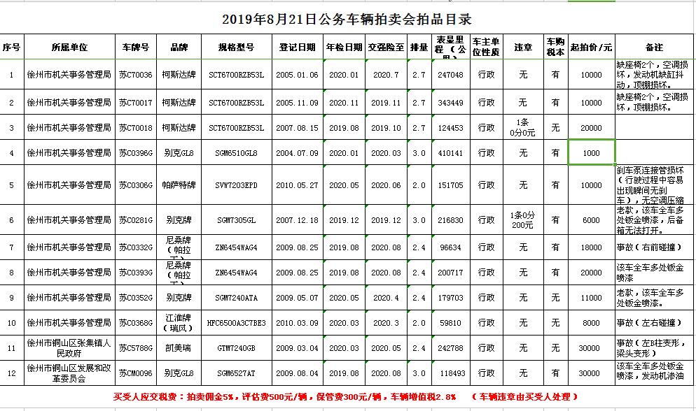 關(guān)注微信公眾號(hào)受委托,我公司定于2019年8月21日13:00時(shí)在徐州市銀地二手車交易市場(chǎng)四樓東南拍賣大廳通過(guò)現(xiàn)場(chǎng)和汽車街網(wǎng)絡(luò)拍賣平臺(tái)同步進(jìn)行的方式公開拍賣以下公務(wù)車輛: