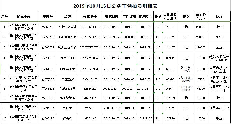 關(guān)注微信公眾號受委托,我公司定于2019年10月16日13:00時(shí)在徐州市銀地二手車交易市場四樓東南拍賣大廳通過現(xiàn)場和汽車街網(wǎng)絡(luò)拍賣平臺(tái)同步進(jìn)行的方式公開拍賣以下公務(wù)車輛: